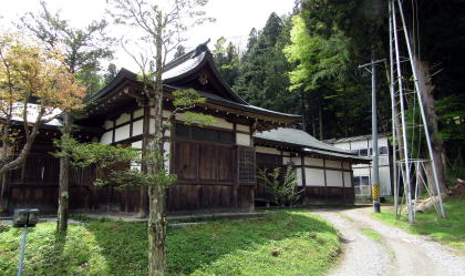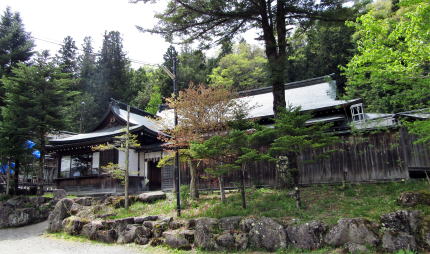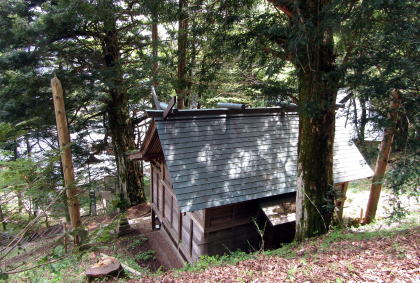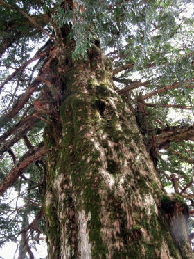 ▲2本の榧の巨樹に挟まれている。背後の榧木の樹齢は170年。