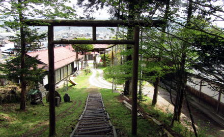 これらを脇に見ながら急斜面を登っていく参道は、まもなく木製の鳥居をくぐります。鳥居があるということは、この辺りの斜面はひとまとまりの神域をなしているということになります。
