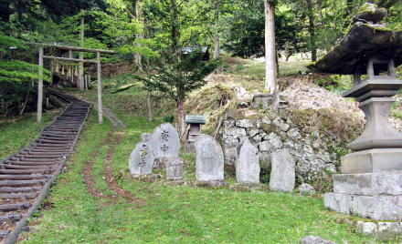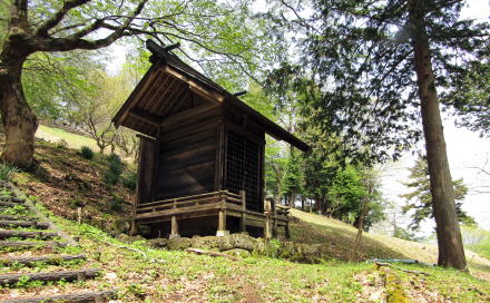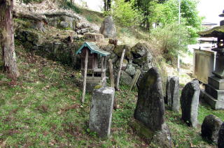 石塔群の背後に祀られた小さな祠は秋葉社で、その周りには小さな御柱が建てられています。