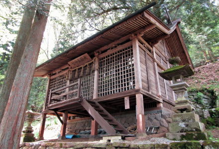 ▲大国主命社の社殿: 基礎部分は急斜面に合わせた造り