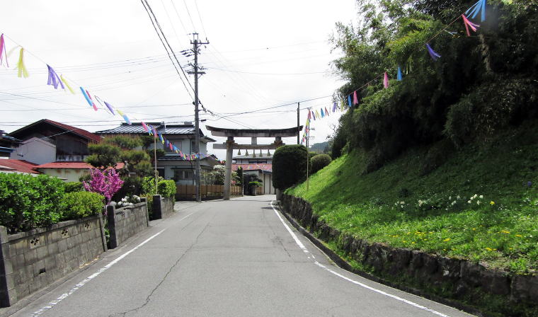▲波除鳥居の脇で旧道は緩やかに曲がる: 鳥居の奥が社務所だ