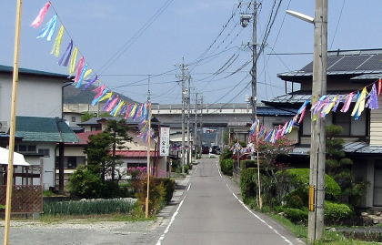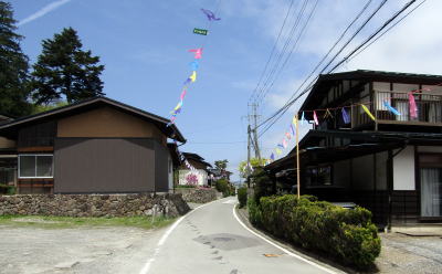 ▲尾根裾斜面の高台に並ぶ家並み。敷地が棚田のように連なる。
