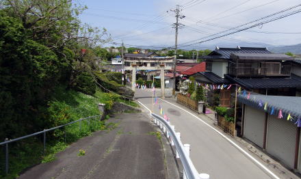 ▲鳥居下から参道を振り返る: 左側が宮ノ脇公館と石塔群