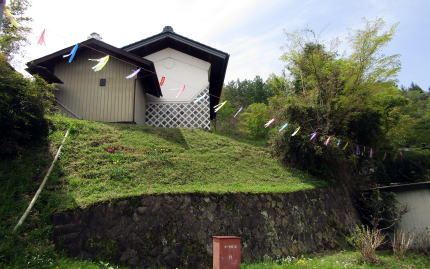 さて、五之鳥居から南東に進むと、旧道が左にゆるく曲がるところで、右手に波除鳥居と出会います。鳥居の手前には、諏訪の伝統的な入母屋造り――赤いトタン屋根――の家屋があって、それが宮ノ脇公館です。住民の集会場のようにも、本宮の施設のようにも見えます。公館の裏(南)には斜面が迫っています。