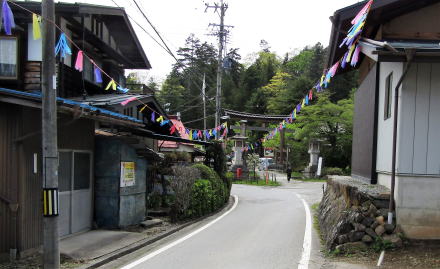 今回は、中洲神宮寺交差点で旧道の細い道「西参道」に入って歩きます。少し歩くと宮の湯の前を過ぎて本宮五之鳥居をくぐることになります。