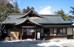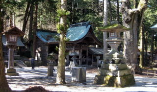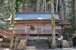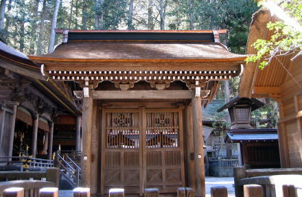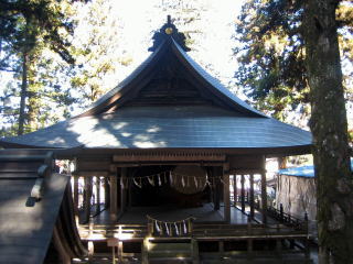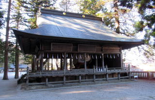 このの壇上の最奥には幣拝殿があって、その前には参拝所門が立ちはだかっています。諏訪大社特有の左右片拝殿が対称の位置に並んでいます。本殿はなく、拝殿の後方に幣殿が置かれています。