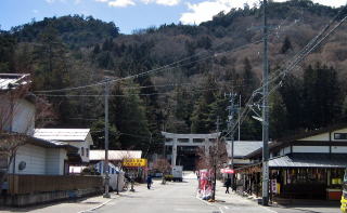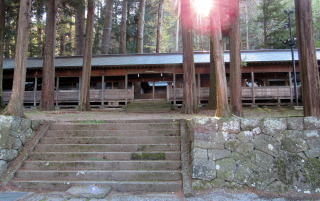 神楽殿から駒形屋まで境内は、鬱蒼とした樹林に陽射しが遮られてほの暗くなっています。そこから、石垣で支えられた壇上の布橋と幣拝殿を見上げると、まるで城郭のように見えます。