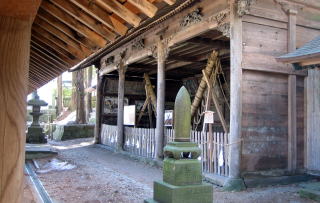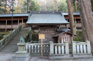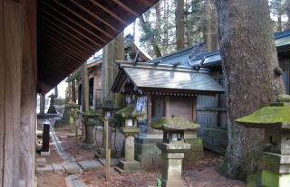 幣拝殿や宝殿が並ぶ一角の手前には「布橋」と呼ばれる渡殿――屋根でおおわれた通路――があります。その奥には境内社の祠や御柱祭の用具などが並んでいます。