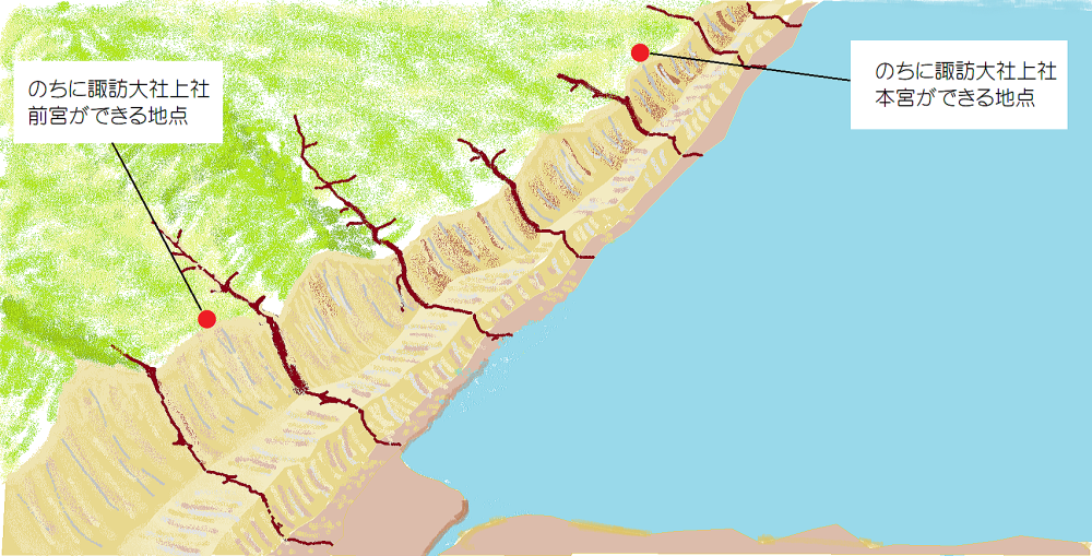 その複合的な扇状地形は、断層崖に直交する何本もの地割れ線に沿って流れ下る河川の浸食・運搬・堆積作用によって形成されたものです。湖岸から見ると、諏訪大神が祀られた社は段丘や丘陵の上に位置しています。