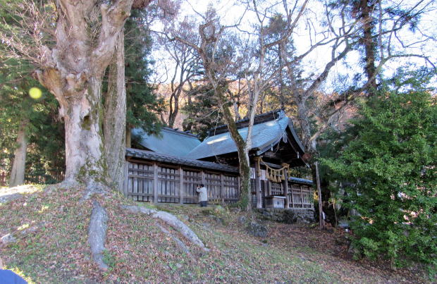 内御玉殿の背後には根元から幹分れした大ケヤキが立っていますが、その下の石段をのぼると本殿まであとわずかです。その先に見える杜のなかに本殿が安置されています。