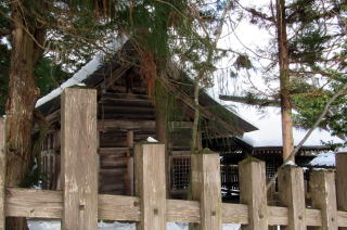 本殿の参拝所には最後の石段をのぼった先の参道を歩いて到達します。参拝所の奥に左右に伸びる結構がありますが、これはタケミナカタとヤサカトメの夫婦神――大祝の始祖――の墳墓の上に建てられた社殿です。これが神域の中心ですから「本殿」という呼び名になっているのかもしれません。