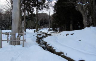 本殿の東脇を流れ下るのは神水「水眼」の流れです。年間を通じて清冽な水――名水と評価されている――が流れ、周囲を潤しています。
