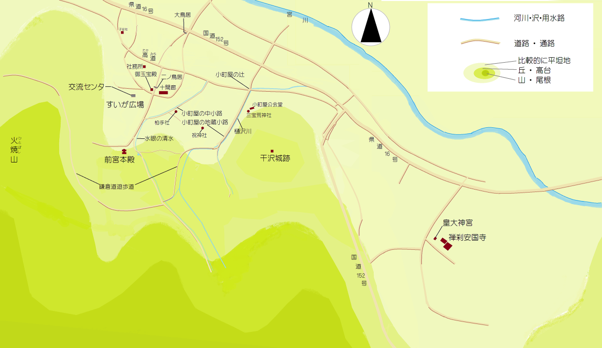 この絵地図は、前宮(大祝氏の居館神殿)が、西側の火焼山の尾根と東側の干沢城跡がある尾根との間に挟まれた小さな尾根丘の裾にあることを示しています。そして、この尾根丘陵は、水眼の流れと樋沢川が形成した扇状地の扇端近くに位置しています。きわめて複合的な地形なのです。