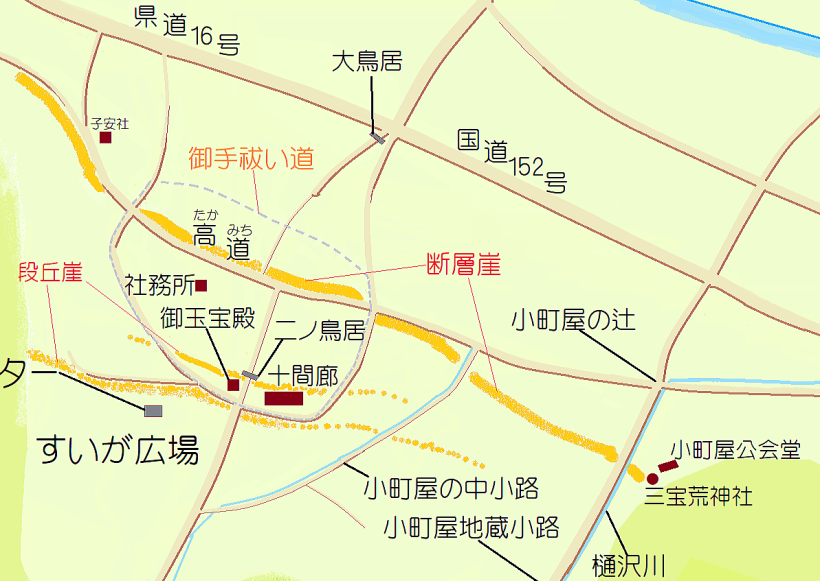 A御手祓い道、すなわち、中世まで「酉の祭り」で騎乗した子どもたちの行列が平穏と豊作を願い厄払いをした順路が、前宮境内でその断層崖を挟み込むような形であること