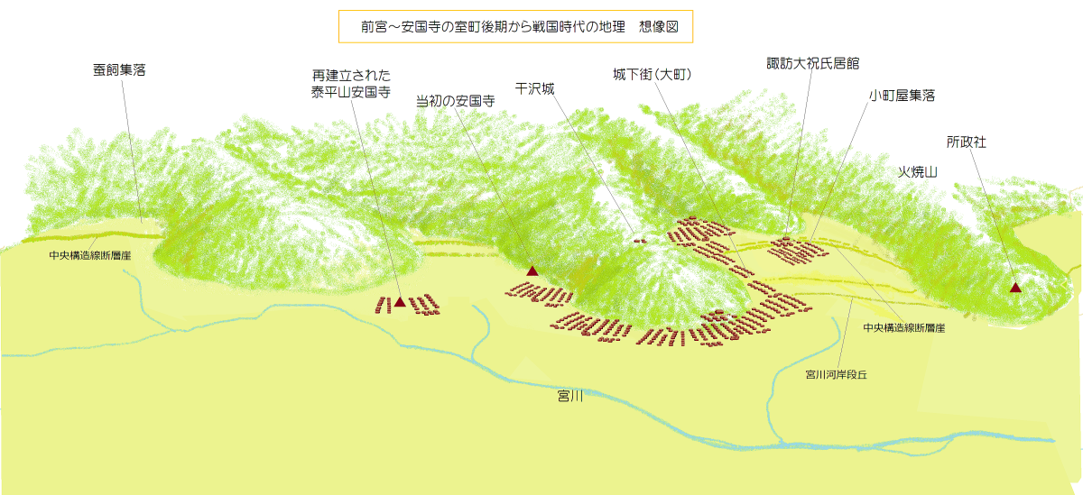上掲の絵地図は、諏訪大社上社前宮から安国寺辺りまでの地形と集落の様子を推測した想像図です。