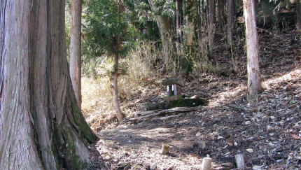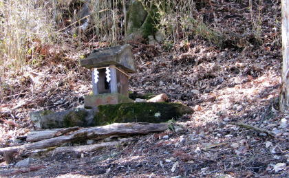 ▲斜度30°を越える急斜面に石祠がある。のぼるのが難しい。