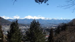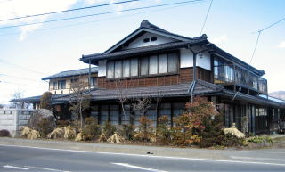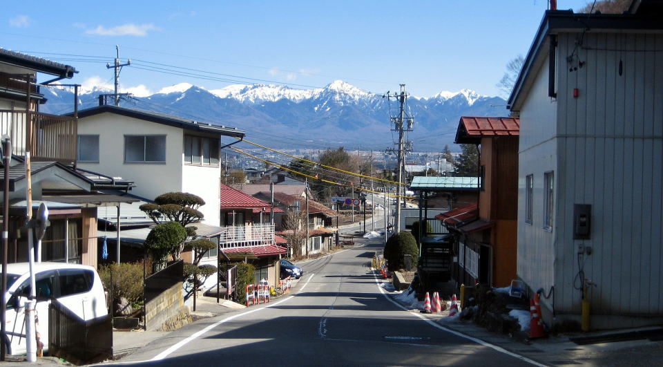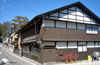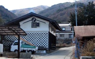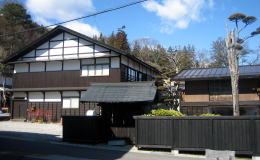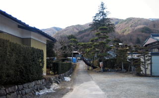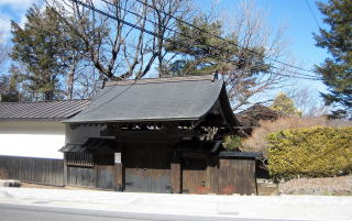 そんなふうに思う私の目は、沿道に古民家や和風の家屋を探し求めることになります。すると、県道16号沿いに何やら由緒がありそうな重厚な薬医門とその奥の庭園樹林を見つけました。かつて諏訪大社の権祝――「ごんのほうり」または「ごんほうり」と読むとか――という神官(祝氏の補佐役)を務めた矢島家邸跡だそうです。