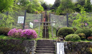 さらに東参道を進むと、南脇に崖のように険しいな斜面に参道石段が見えてきます。これが北斗神社で、参道の段数は200もあるそうです。崖の上の社殿まで高低差は、だいたい30メートルほどありそうです。