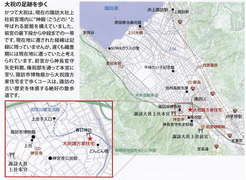 上掲の2つの絵地図(解説文付き)は、諏訪市教育委員会が刊行したパンフレット『諏訪上社大祝諏方家住宅』から引用したものです。これに――同じ資料の「敷地配置図」をもとにして――現在の敷地と周囲の風致区域を上書きしてあります。幕末まで諏方家の居館がどのような縄張りと構えだったかを想像するために掲載しました。
