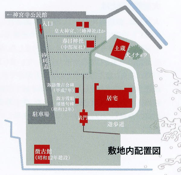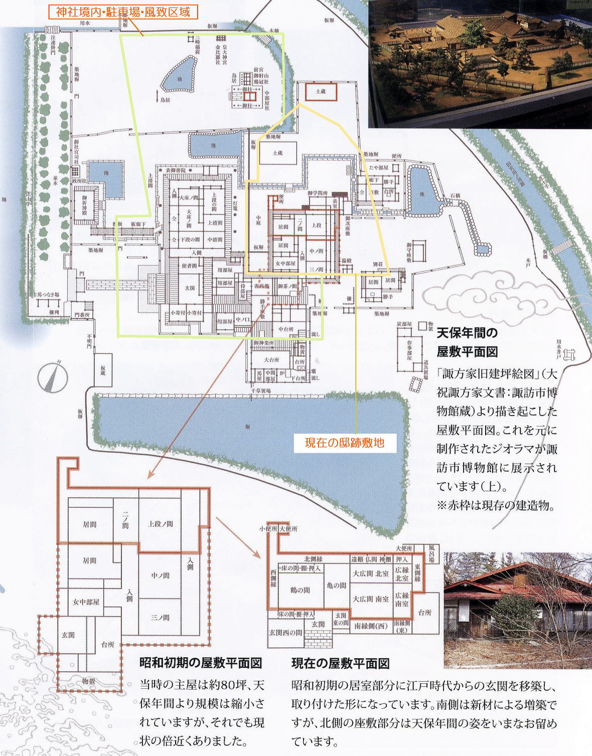 今、大祝諏方家の住宅跡として保存されているのは、往時の20分の1ほどの面積でしかなく、隣接する神社境内や駐車場、風致区域を合わせても8分の1ないし10分の1の範囲しか残されていないということになります。