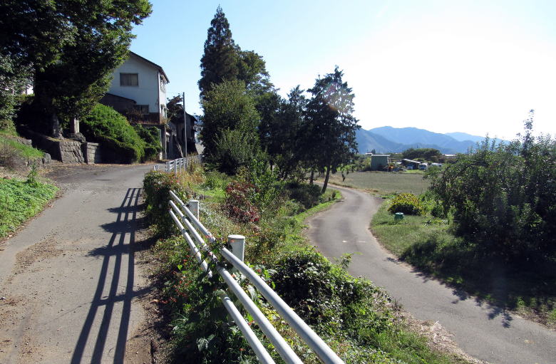 小河原地区では、段丘の西に広がる低地水田地帯と最上部の河岸段丘の地面とのあいだの高低差は、平均で4メートル、最大で6メートル近くにもなることがわかりました。水田がある低地から一段上がった段丘面に集落西端の道路が通っていて、そこからさらに一段崖をのぼった位置に家屋の敷地があるので、小河原は二段の段丘になっています。