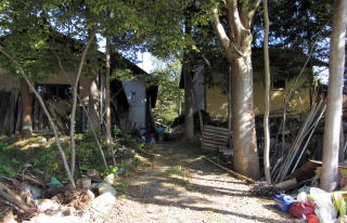▲段丘崖を覆う藪。道路は一段上の段丘上を通っている