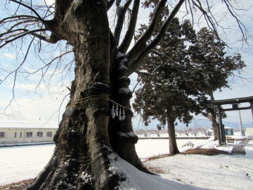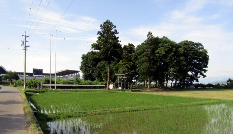 善光寺平の伝統的な風景は、村落ごとに鎮守の神社があって、神社の境内と鎮守の杜は、水田畑作地帯のなかに大海のなかの島のように浮かんで見えます。春から秋には樹林の枝葉が生い茂って、境内は薄暗くなります。真夏には強い陽射しと根っ暑熱を遮ってくれて、神域には田園の風が吹き抜けて、涼やかでありがたい空間となります。このような神社の鎮守の杜を社叢と呼びます。