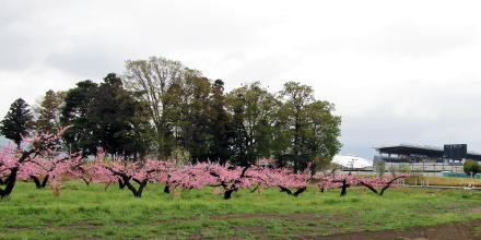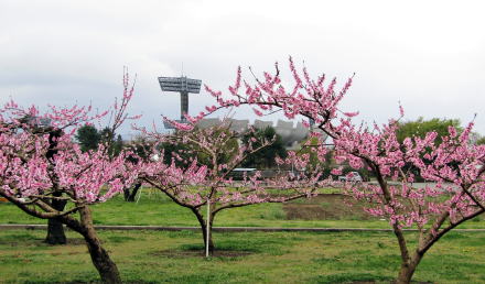 ▲4月は桃の花の季節。あいにくの花曇り。桃花に囲まれる社叢。