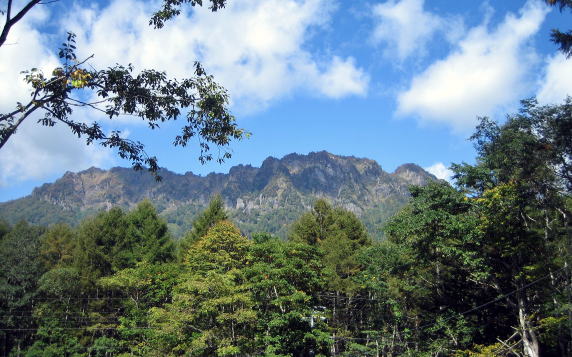 この日(2016年10月8日)、戸隠は天気が回復して青空が広がりました。奥社近くの森の樹間から戸隠山の切り立った岩稜がくっきりと眺めることができました。この岩稜は、まさに鋸の歯のように狭い幅で、登山には相当の覚悟が必要です。