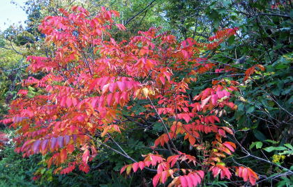 ウルシやヌルデ、ナナカマド、そしてアケビや蔦などの蔓植物はいちはやく紅葉しています。
