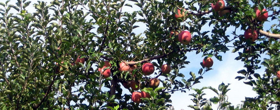 長野市川中島平のリンゴ園:晩秋(2012年11月末)に収穫直前のサンフジの実をつけたリンゴの木の枝を撮影 |