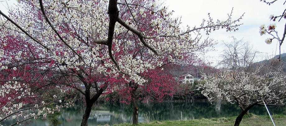 長野市信州新町:琅鶴湖の畔にある「ろうかく梅園」 撮影は2017年4月はじめ |