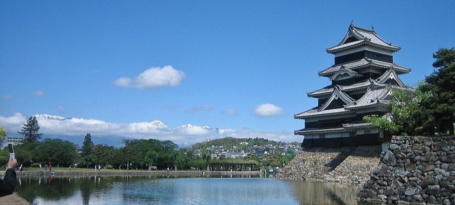 松本市松本城公園:常念岳と蝶ケ岳を背景にした松本城 撮影は2012年5月中旬 |