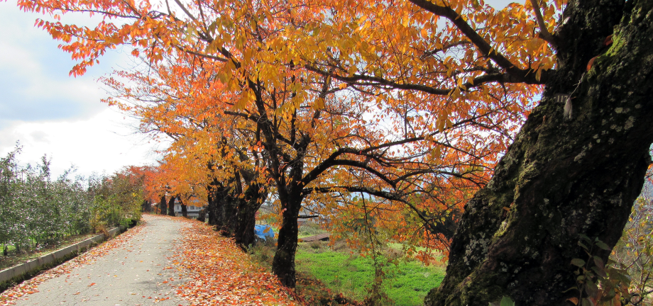| 大町市北山田町~山田町の千国街道(塩の道)。今年は温暖な晩秋で、この時季にも桜並木の紅葉が残っていた。 撮影は2018年11月上旬 |