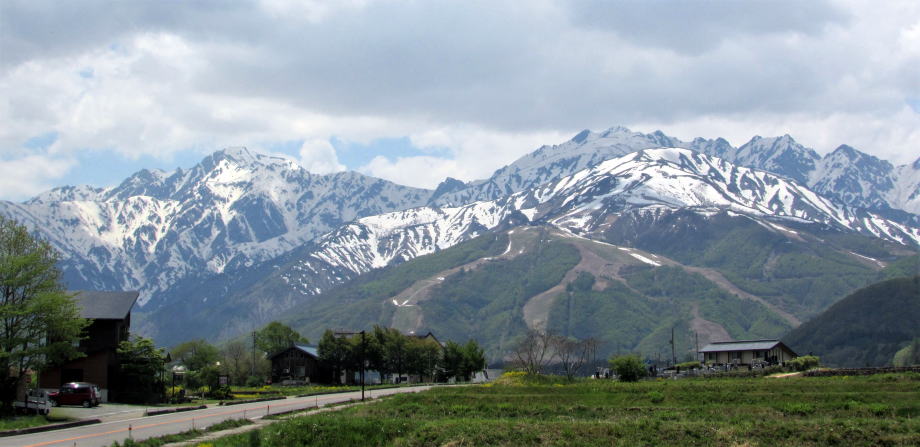 小谷村千国の里から塩の道を南にたどって、切久保・塩島の辺りまでやってきたとき、岩岳の麓で圧倒的な残雪の山並みを目にしました。 上掲のシーンでは、唐松岳の左に五竜岳の秀峰と稜線、右には白馬鑓ケ岳に続く岩稜が展望できます。近年は気候温暖化で五月の残雪の量が減ってきています。その分、雪からのぞく岩肌が、山脈が険阻な岩塊からできている様子がはっきりわかります。 。 |