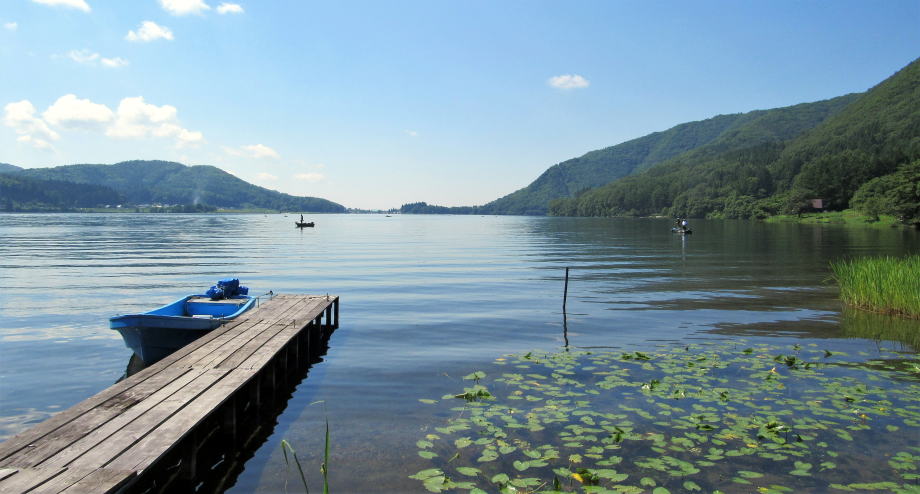 | 写真は大町市の木崎湖の北岸の末の風景です。木崎湖の西岸の千国街道を歩いて湖畔と集落の様子を取材しました。大町市街は中央部の谷間の先にあります。 撮影は2021年7月下旬 |