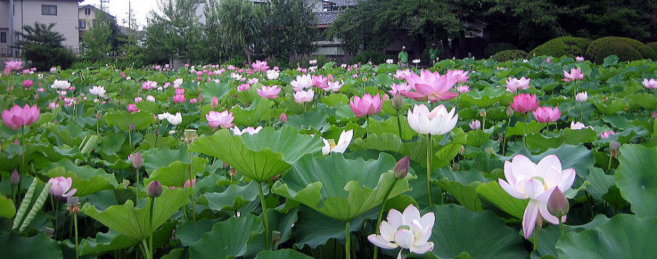 上田市信濃国分寺 の境内や庭園の環境保全や整備は、長年、近隣のヴォランティア・グループがおこなってきた。文化財や伝統行事の保存にも協力している。 本堂裏手の休耕湿田に蓮を植え育てている。毎年、7月下旬には「蓮の花祭り」主催して、寺への来訪者を茶菓のサーヴィスや庭園案内などの接待をおこなっている。 |