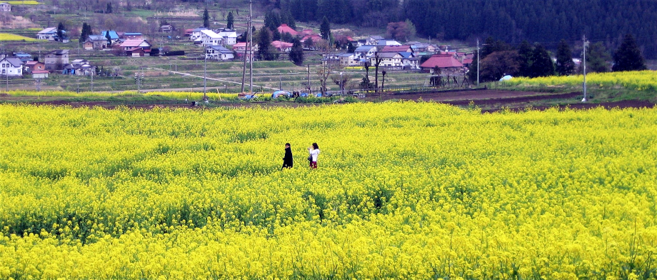 | 飯山市 菜の花公園の菜の花畑。若いカップルに遠景モデルになっていただきました。 撮影は2016年4月下旬 |