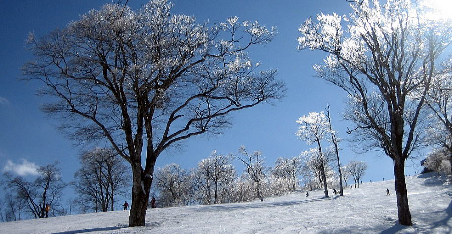これもやまびこゲレンデ(Dコース)の朝10時頃の様子です。気温は氷点下8℃を割っていました。 真夜中から明け方にかけてブナやシラカバ、ダケカンバの枝先は霧氷で白銀に装飾されました。陽が昇ってきても、枝の先端部には霧氷が残っていて、強い陽射しを浴びてまぶしく輝きます。 |