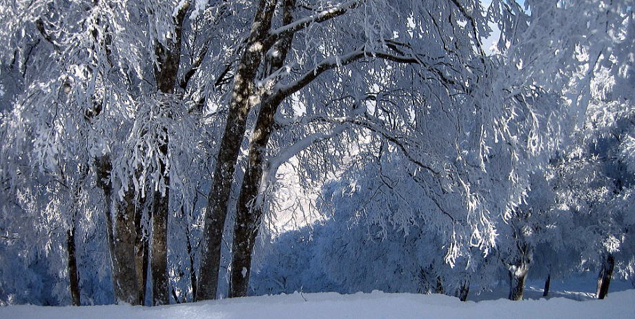 | 野沢温泉村の野沢温泉スキー場やまびこゲレンデ 夜来の雪が晴れた朝、山頂部のブナ原生林の光景。 撮影は2008年1月はじめ |
