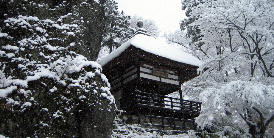 | 千曲市姨捨の長楽寺観音堂の雪景色。巨大な溶岩塊の傍らにあって、四季折々に美しい山里風景が楽しめる。 撮影は2016年11月下旬 |