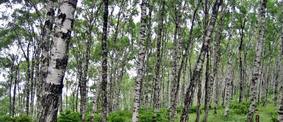 美ケ原高原に上田市の旧武石村から登っていくと、山頂近くに白樺平という森があります。数ヘクタールにわたって白樺林が広がっています。じつに美しい風景です。 この日は、雨が上がるのを待ちかねてクルマで高原に向かいました。途中で晴れてきましたが、山頂部はまだ深い霧に包まれていましたが、白樺林ではかなり視界が広がってきて。300メートルほど先が見えるようになりました。 |
