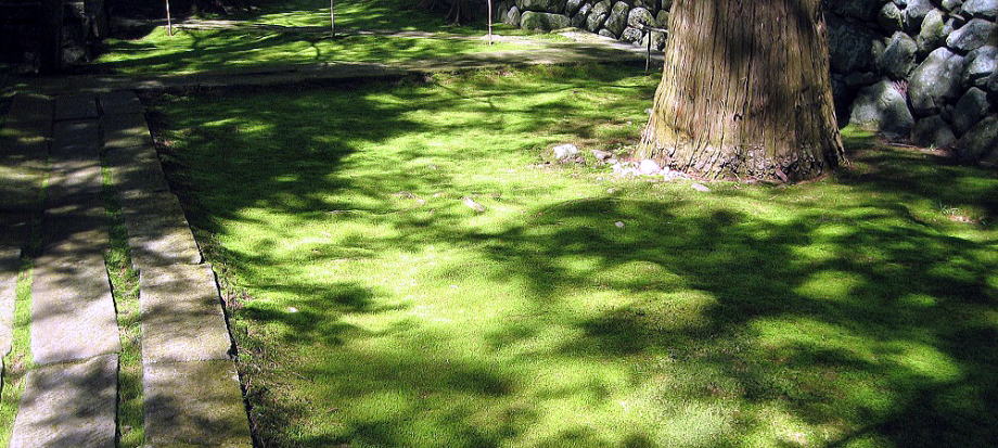 | 佐久市前山の貞祥寺の境内 山林に取り巻かれた境内の地面を美しい苔が覆い尽くしている。 撮影は2015年5月下旬 |