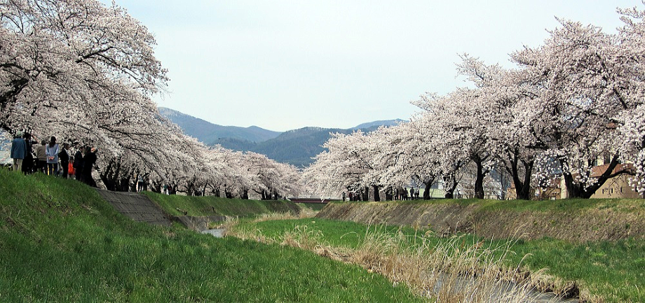 横河川は諏訪湖に流れ込みますが、その少し上流には、両河畔に長さ700メートル以上にわたって桜並木があります。例年、4月20日頃には、河床を覆い尽くすように広がった枝に桜の花が開きます。 その頃には、地元諏訪地域や全国から桜花を見るために多数の人びとが訪れて、河畔の散策を楽しみます。河畔を河口まで歩いて、さらに諏訪湖畔を一周するように植えられた桜並木の花を愛でる人びとでにぎわいます。 |