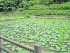 蓮の葉が広がった参道脇の池(6月)