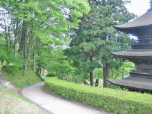 三重塔の袂まで登ってみました。ここでも、木々は競い合うように若葉を萌えさせています。輝くようなカエデの若葉を透かして、三重塔を眺めるのも風情があります。