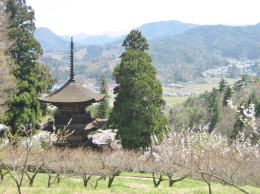 裏山(北側)の梅林から望む三重塔 |