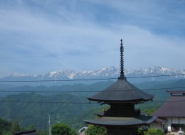 雄大なアルプスを背に負う三重塔