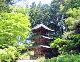樹林に囲まれて典雅に聳える三重塔 |