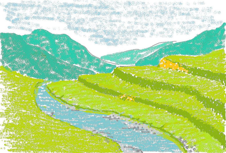 このイメージ画は、南から北を望んで、上田市国分付近の千曲川と河岸段丘を描いたもの。河の右側(東側)は扇状地が続いて、やがて丘陵となり、湯の丸高原や菅平などの山岳に達する。
